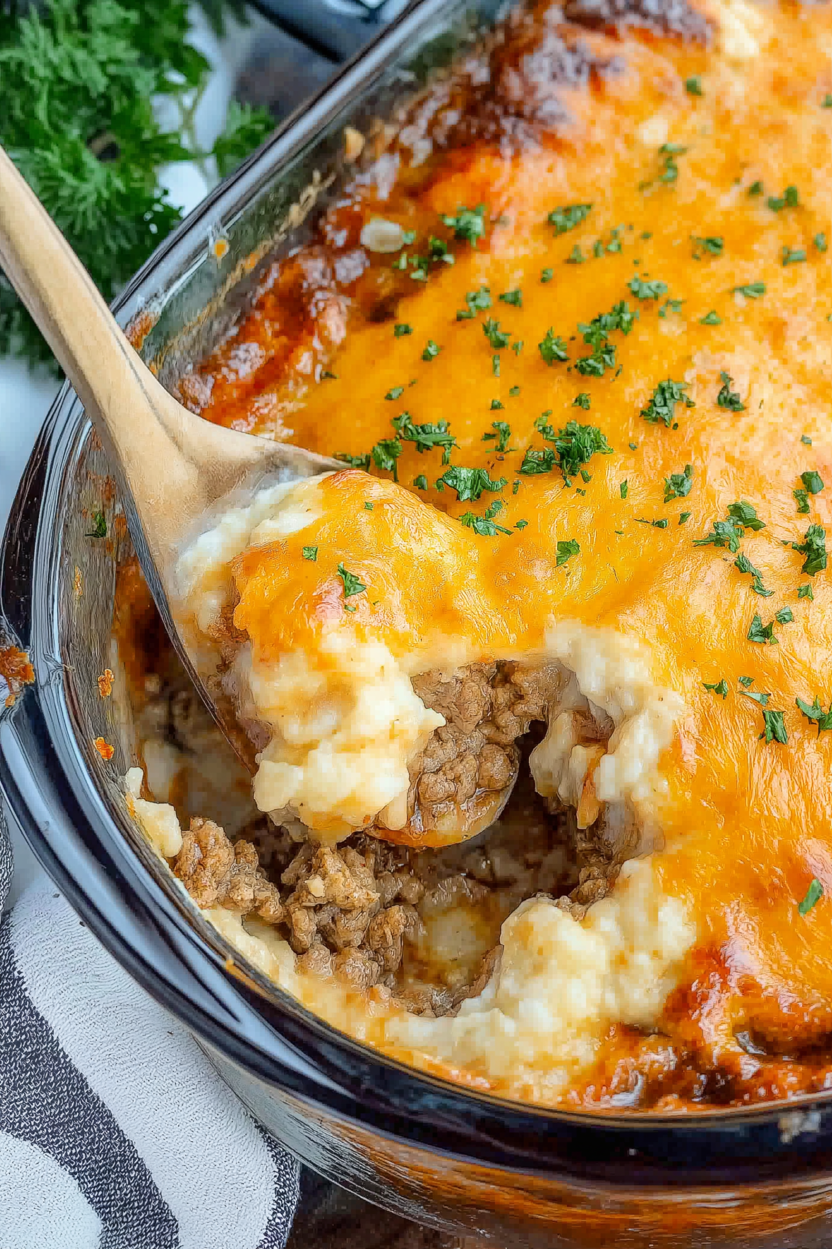 Breakfast Cobbler: Add scrambled eggs and breakfast sausage in place of GROUND BEEF